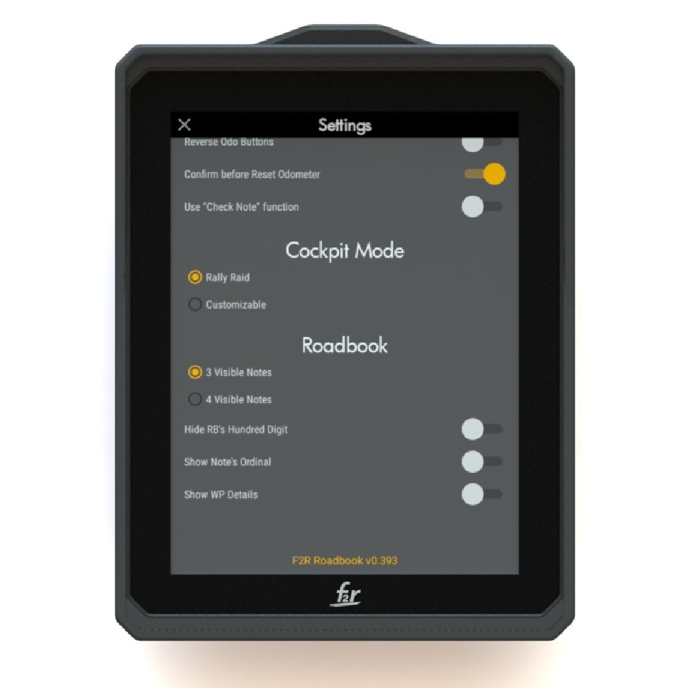 J'ai utilisé le F2R pendant un rallye de sept jours et il a parfaitement fonctionné, un système de navigation rallye vraiment conçu pour cet usage. L'écran n'a pas du tout été affecté par la lumière solaire, les vibrations et est très robuste avec un grand dissipateur thermique à l'arrière. J'ai apprécié son fonctionnement avec les boutons multifonctions F2R. La configuration et les modifications sont très intuitives et faciles. L'écran tactile fonctionne parfaitement avec des gants et a juste le bon niveau de sensibilité pour éviter les sélections accidentelles. Plus besoin de papier pour moi lors des futurs rallyes, cet appareil est excellent et bien supérieur à tout autre modèle sur le marché.